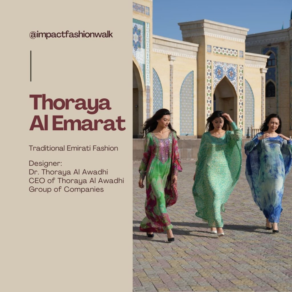 Brand Concepts: Thoraya Al Emarat is a UAE National brand that captures the spirit of traditional Emirati attire in its designs. The brand aims at encouraging women to express themselves through aesthetically impressive Emirati designs. Dr. Thoraya Al Awadhi has exhibited in various shows across the UAE and is popular for bold traditional designs.